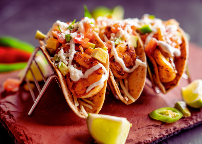 Three corn tortillas filled with succulent jerk-spiced shrimp, topped with fresh mango salsa and lime. Chef G's unique jerk seasoning gives these tacos a perfect balance of heat and sweetness.